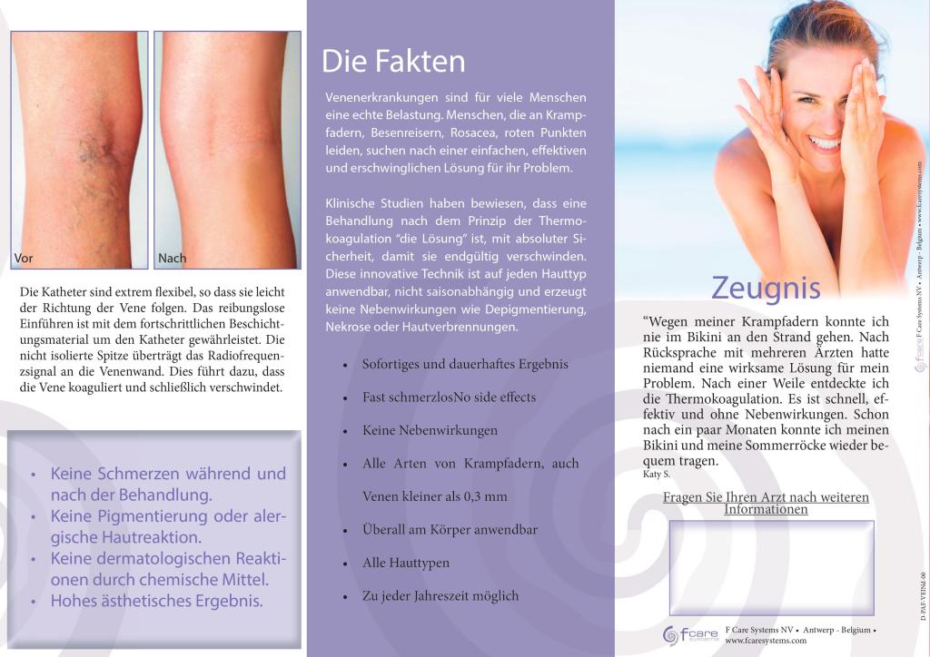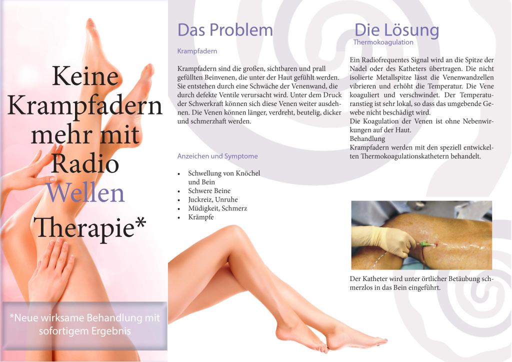 Hier finden Sie Informationen zu der Krampfaderbehandlung mittels der Radiofrequenz-Therapie. Diese basiert auf dem Prinzip der Thermokoagulation und erwärmt die Venenwand, indem es ein Hochfrequenzsignal sendet, das die Zellen in Schwingung versetzt. Dadurch erhöhen sie ihre Temperatur, was dazu führt, dass die Vene koaguliert und schließlich verschwindet. Diese Behandlung ist schnell, effektiv und ohne Nebenwirkungen.